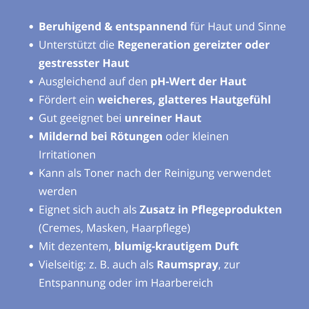 Es bringt die Haut ins Gleichgewicht, wirkt erfrischend und kann helfen, empfindliche oder zu Irritationen neigende Haut zu beruhigen.