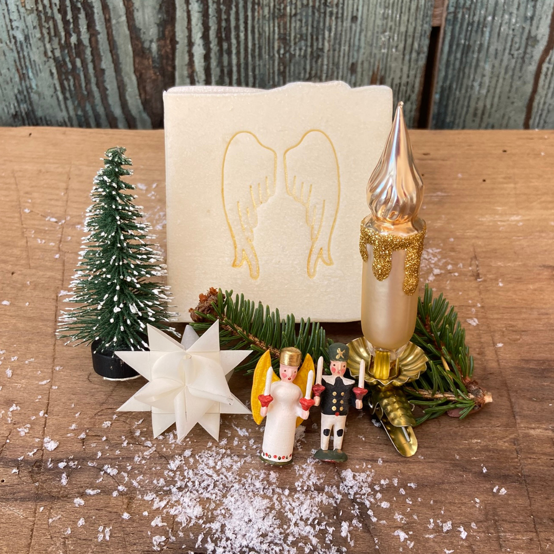 Die in Handarbeit geprägten Engelsflügel und ein Hauch von goldenem Glitzer machen dieses Seifenstück zu einem liebevollen Geschenk für alle, die himmlische Pflege schätzen.