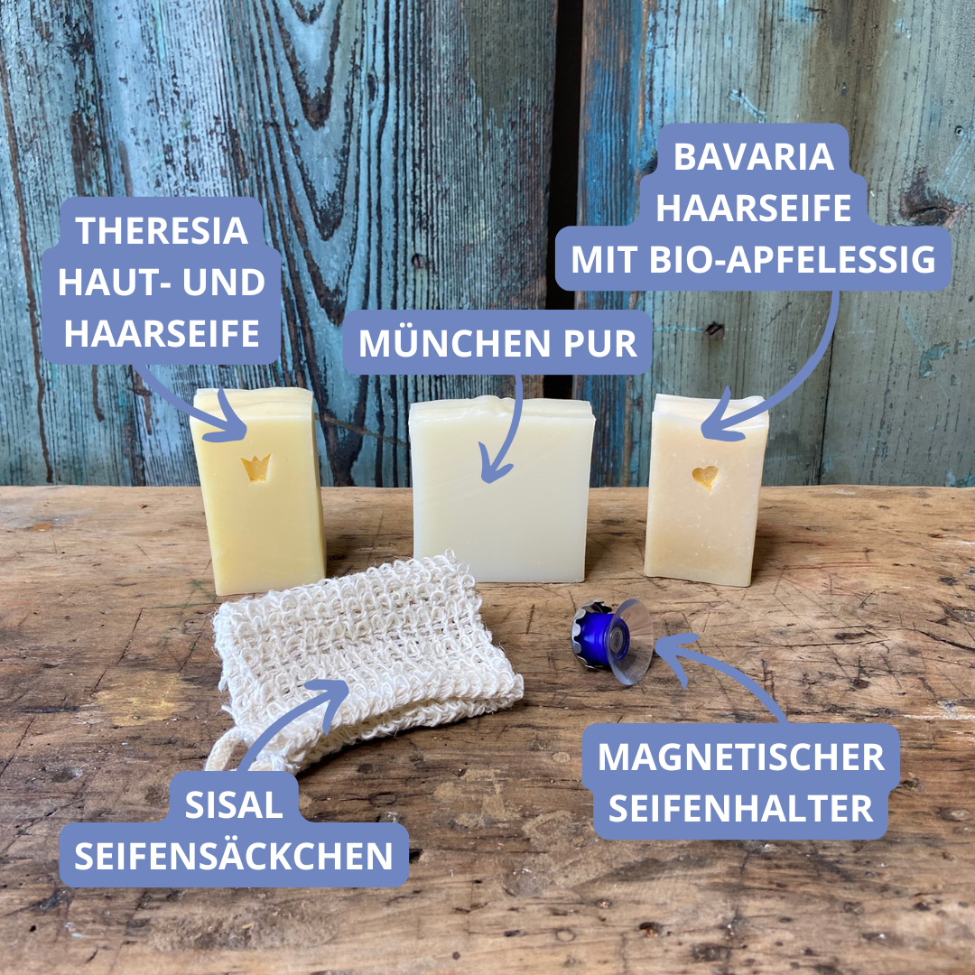 Mit diesem Set bist Du rundum versorgt: hochwertige, handgemachte Naturseifen für Haare, Gesicht und Körper – dazu praktische Helfer für mehr Komfort und Langlebigkeit.